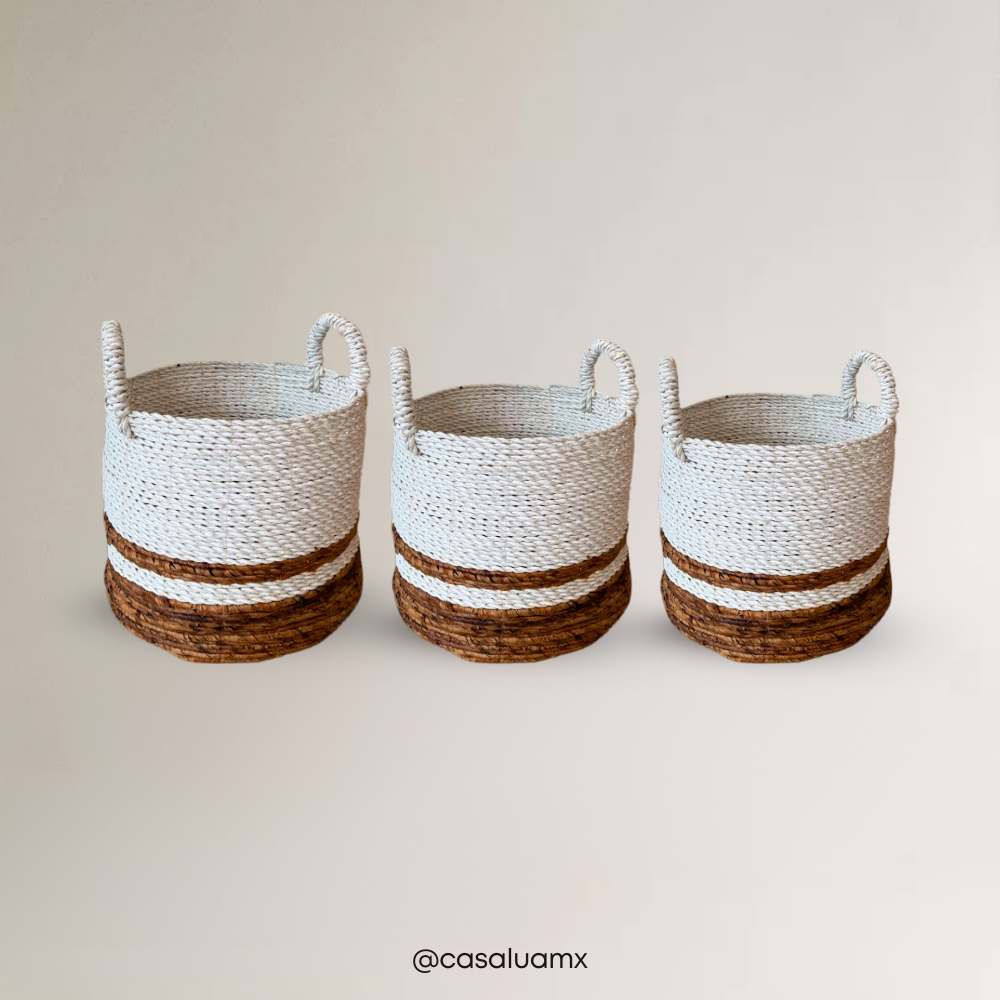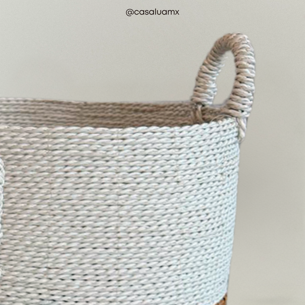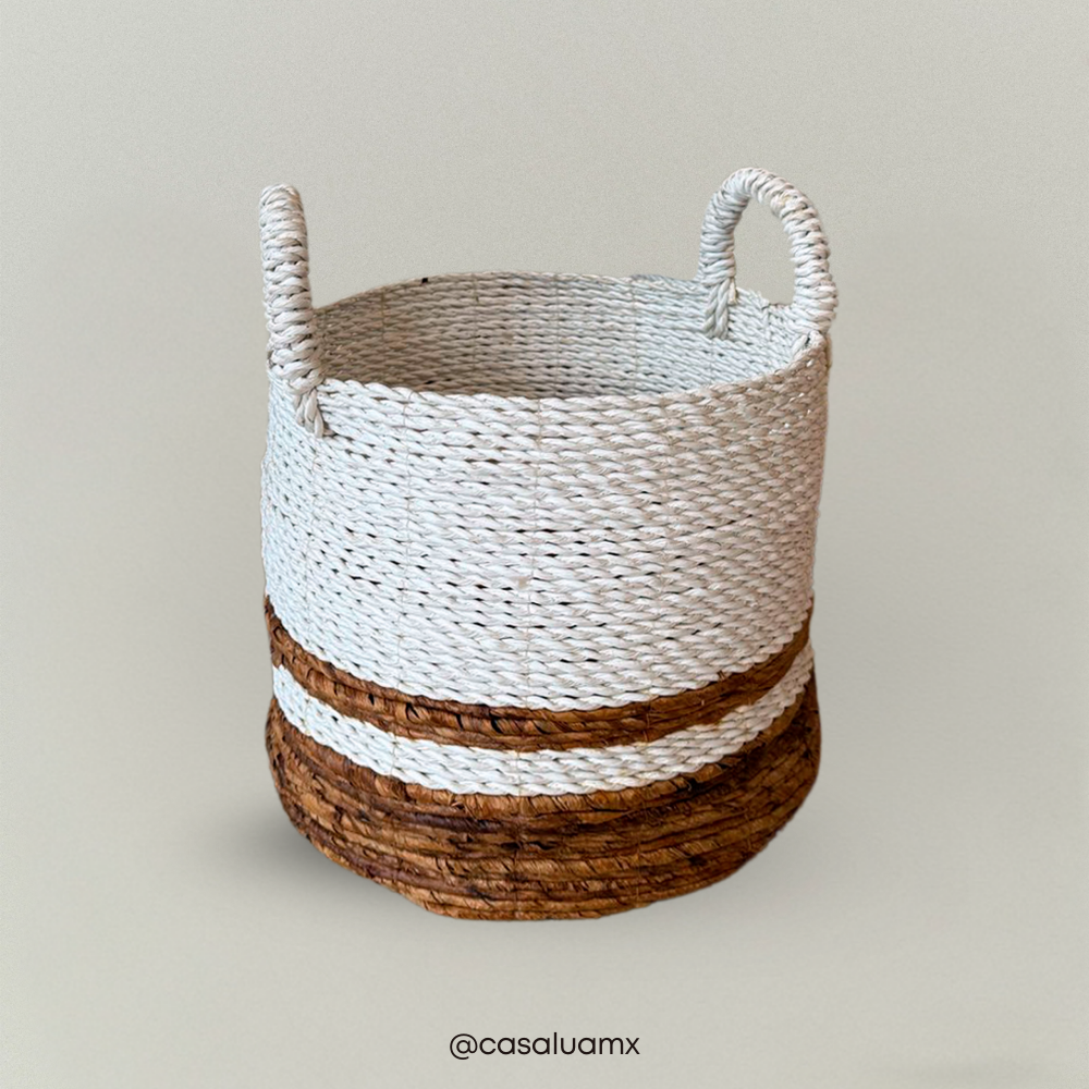 Un grueso tejido en hoja de plátano, ricas variaciones de color natural y asas envolventes en ángulo distinguen estas cestas artesanales. Disponibles en tres tamaños, cada pieza hecha a mano presenta características individuales.