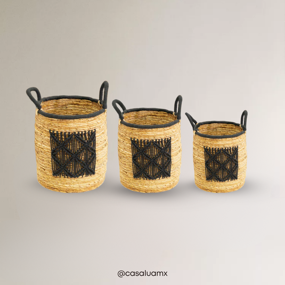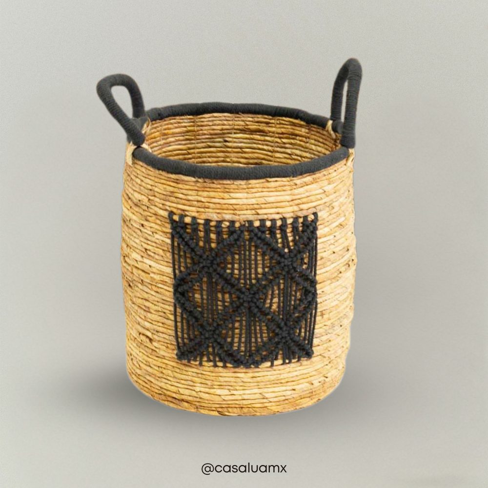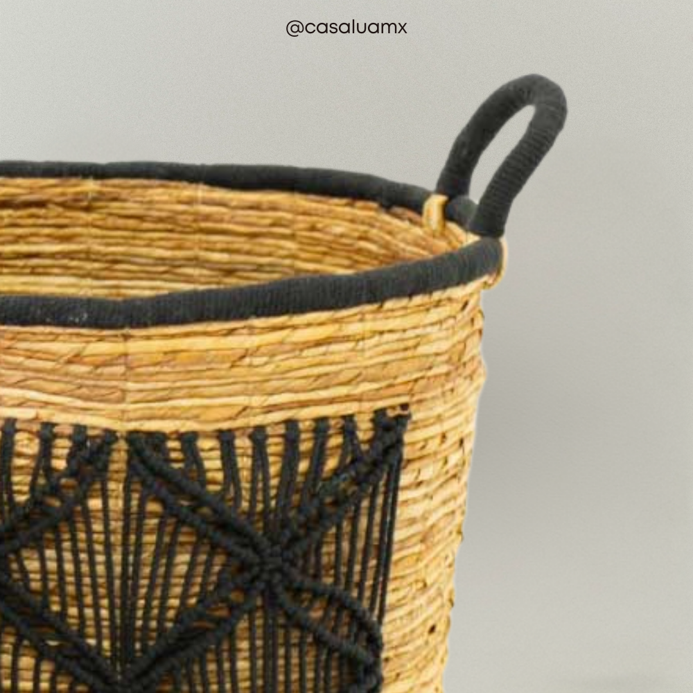 Artesanos tejen a mano hojas de plátano, creando bordados exclusivos con algodón en color negro para un diseño bohostyle. Las robustas asas son suaves al tacto, pero lo suficientemente fuertes para transportar los objetos almacenados. Esta opción de almacenamiento informal añade un cálido toque natural a cualquier habitación. Perfectas para maceteros, almacenar toallas, ropa, juguetes, etc.