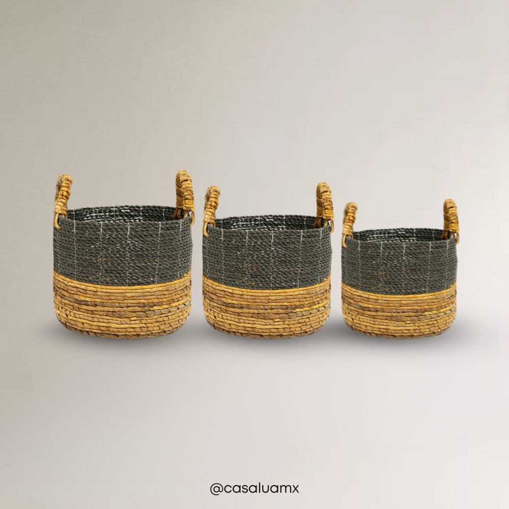 Nuestros cestos André tejidos a mano con combinación de hierbas naturales y hoja de plátano son una de nuestras colecciones preferidas. Las manijas robustas y el tejido te permiten moverlas fácilmente de un lugar a otro. Perfectas para maceteros o almacenar toallas, ropa de cama, frazadas, etc.