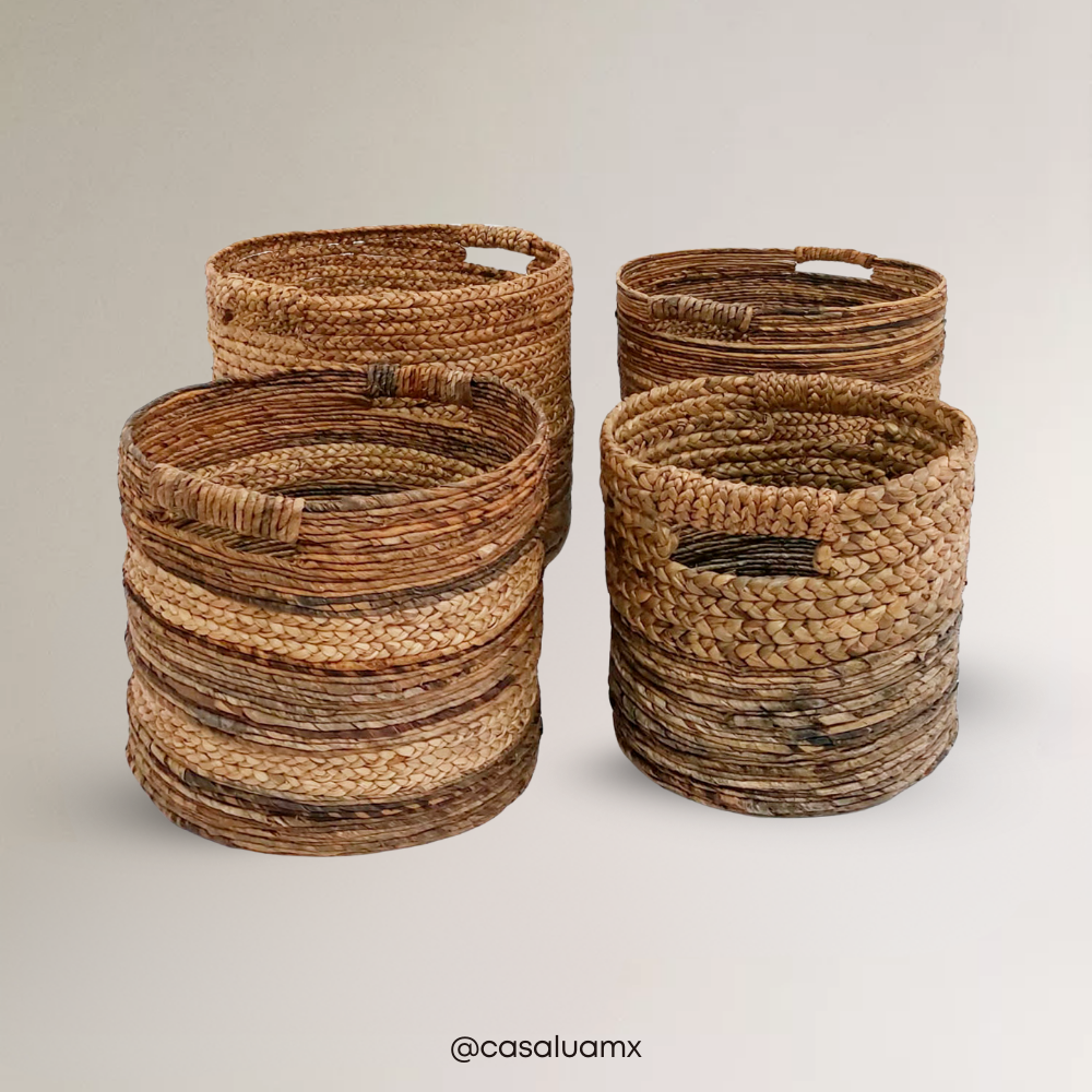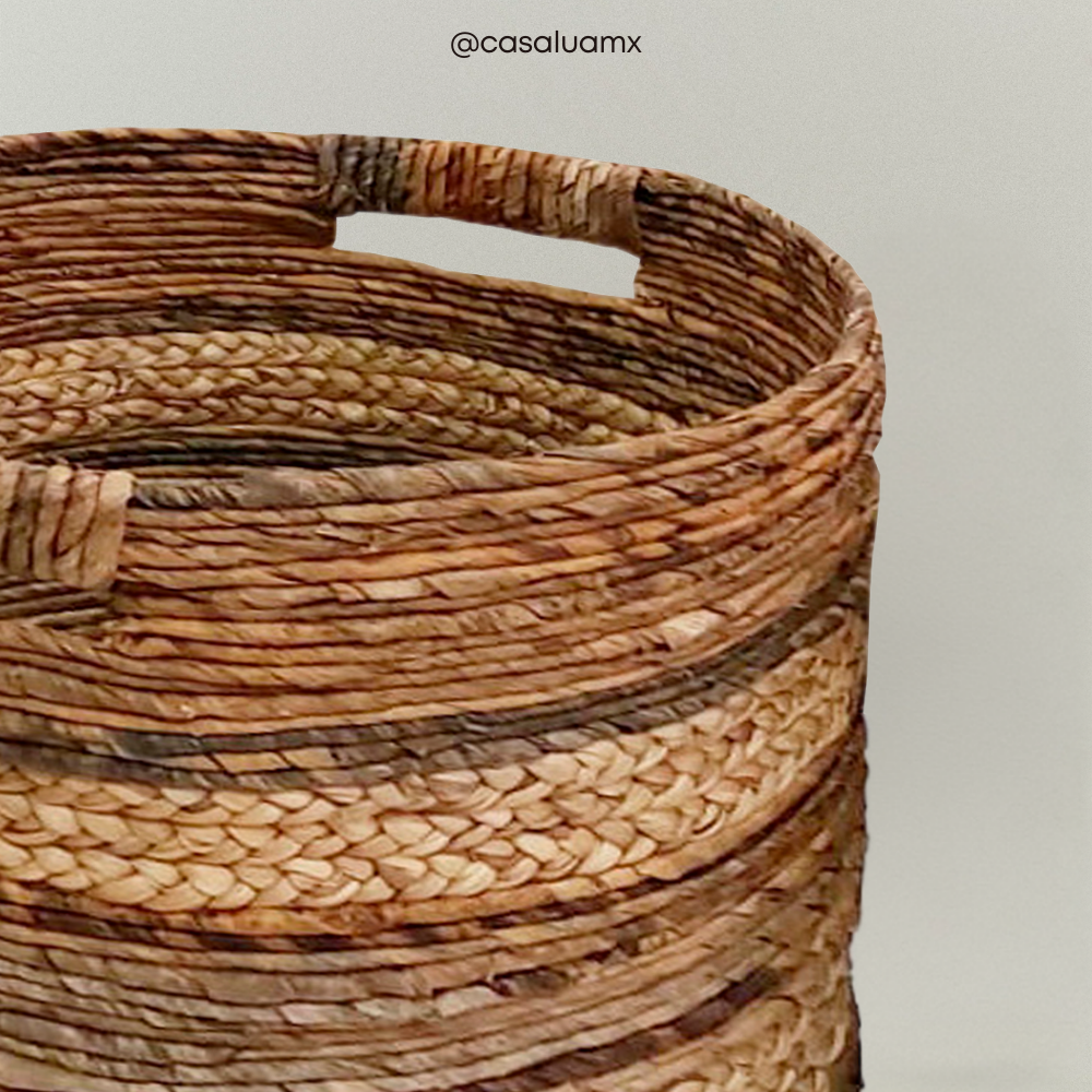 Un grueso tejido en hoja de plátano, ricas variaciones de color natural y asas envolventes en ángulo distinguen estas cestas artesanales. Disponibles en cuatro tamaños, cada pieza hecha a mano presenta características individuales.